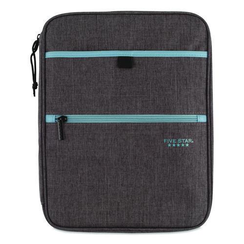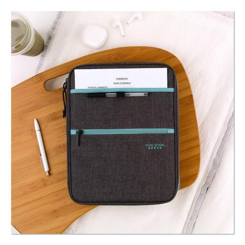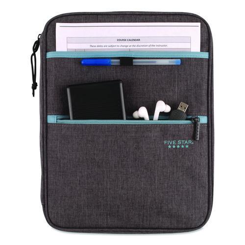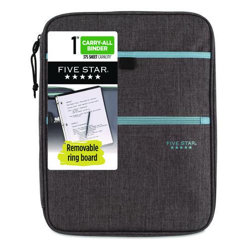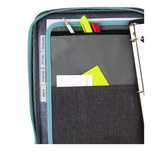 Carry it all in one convenient, zippable spot! Lasts all year! Guaranteed! Carry-all binder is made of durable polyester to withstand daily use. Four tabbed dividers allow you to store papers and organize them by subject. The removable ring board provides a portable writing surface. Full sized pocket inside of the binder easily stores notes and handouts. 1″ binder holds up to 375 sheets, when using 15-lb filler paper. Three O-rings allow for increased paper storage and keep 3-hole punched sheets securely in place. Exterior pockets for quick access to papers and supplies. Available in Gray/Mint, Olive/Peach, Black/Gray and Navy/Blue. Color chosen for you.