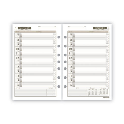 Product Details** Global Product Type Appointment Book/Personal Organizer Refills Dated Yes Academic Year No Calendar Format Daily/Monthly Edition Year 2026 Calendar Term 12-Month (Jan to Dec) Color Family White Calendar Spread Format One Day per Page,One Month per Two-Page Spread Julian Dates Yes Size (Bound-Side First) 8.5 x 5.5 Appointment Ruling 15-min, 7 AM to 7 PM (Mon-Sun) Calendar Reference Blocks Past Month,Current Month,Future Month Sheet Color(s) White Reversible No Refill Type Daily Planning Pages,Monthly Planning Pages For Use With AT-A-GLANCE® One-Page-Per-Day Planners Seasonal Availability Yes Product Biodegradability Indicator N Product Biodegradability in Days 0 Product Compostability Indicator N Pre-Consumer Recycled Content Percent 0% Post-Consumer Recycled Content Percent 0% Total Recycled Content Percent 0% Country Of Origin VN Carton Weight 15 lbs. Carton Pack Quantity 12 EA Pack Quantity 0 UPC 038576392847 UNSPSC 44112005 Shipping Weight & Item Dimensions Weight 1.28 lbs. Length 8.5 in Height 1 in Width 5.75 in