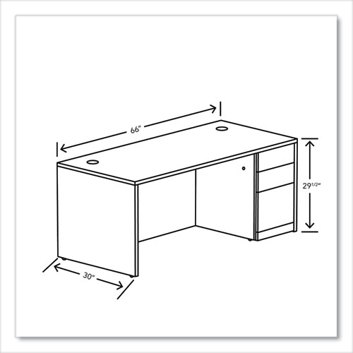 Product Details** Global Product Type Pedestal Office Desks Worksurface Shape Rectangular Color Family Mahogany Pedestal Count 1 Keyboard/Mouse Platform Indicator No CPU Holder/Platform Indicator No Number of Drawers 3 Series Name HON® 10500 Series™ Worksurface/Base Color Mahogany Worksurface Material Particleboard,Thermal Fused Laminate (TFL) Worksurface Width 66″ Worksurface Depth 30″ Worksurface Thickness 1″ Edge Detail Profile Square Base Material Particleboard,Thermal Fused Laminate (TFL) Overall Width (Max) 66″ Overall Depth (Max) 30″ Overall Height (Max) 29.5″ Pedestal Types Hanging: Full-Height Drawer Type Right: Box/Box/File Caster/Glide/Wheel (4) Leveling Glides Book Box Indicator No Weight (Fully Assembled) 262 lb Product Biodegradability Indicator N Product Biodegradability in Days 0 Product Compostability Indicator N Compliance Standards Level 2 Certified,Meets or Exceeds ANSI/BIFMA Standards,Meets or Exceeds ISTA Standards,SCS Indoor Advantage Certified Pre-Consumer Recycled Content Percent 35% Post-Consumer Recycled Content Percent 3% Total Recycled Content Percent 38% Special Features Right Pedestal: Box/Box/File Country Of Origin US Carton Weight 262 lbs. Carton Pack Quantity 1 EA Pack Quantity 0 UPC 020459206426 UNSPSC 56101703 Shipping Weight & Item Dimensions Weight 262 lbs. Length 68.38 in Height 31.38 in Width 32.38 in Warranty Backed by the HON Full Lifetime Warranty.