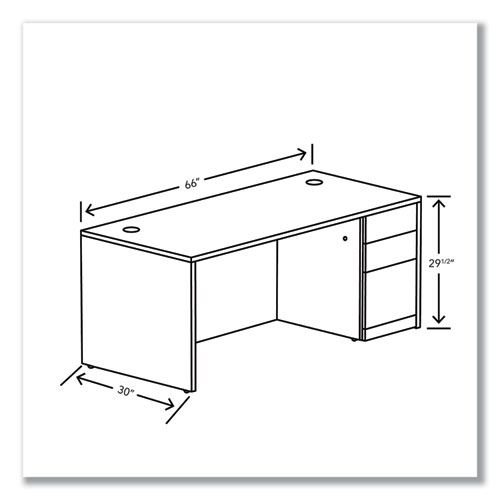 Product Details** Global Product Type Pedestal Office Desks Worksurface Shape Rectangular Color Family Walnut Pedestal Count 1 Keyboard/Mouse Platform Indicator No CPU Holder/Platform Indicator No Number of Drawers 3 Series Name HON® 10500 Series™ Worksurface/Base Color Pinnacle Worksurface Material Particleboard,Thermal Fused Laminate (TFL) Worksurface Width 66″ Worksurface Depth 30″ Worksurface Thickness 1″ Edge Detail Profile Square Base Material Particleboard,Thermal Fused Laminate (TFL) Overall Width (Max) 66″ Overall Depth (Max) 30″ Overall Height (Max) 29.5″ Pedestal Types Hanging: Full-Height Drawer Type Right: Box/Box/File Caster/Glide/Wheel (4) Leveling Glides Book Box Indicator No Weight (Fully Assembled) 262 lb Product Biodegradability Indicator N Product Biodegradability in Days 0 Product Compostability Indicator N Compliance Standards Level 2 Certified,Meets or Exceeds ANSI/BIFMA Standards,Meets or Exceeds ISTA Standards,SCS Indoor Advantage Certified Pre-Consumer Recycled Content Percent 35% Post-Consumer Recycled Content Percent 3% Total Recycled Content Percent 38% Special Features Right Pedestal: Box/Box/File Country Of Origin US Carton Weight 262 lbs. Carton Pack Quantity 1 EA Pack Quantity 0 UPC 782986018025 UNSPSC 56101703 Shipping Weight & Item Dimensions Weight 262 lbs. Length 68.38 in Height 31.38 in Width 32.38 in Warranty Backed by the HON Full Lifetime Warranty.