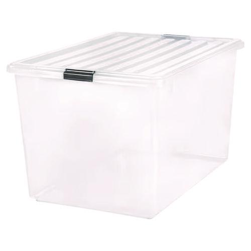 This Iris 132 qt. clear storage box is oversized to fit large storage needs. Securely stack multiple units to maximize storage space. It is great for storage in the garage, basement, attic, or closets.