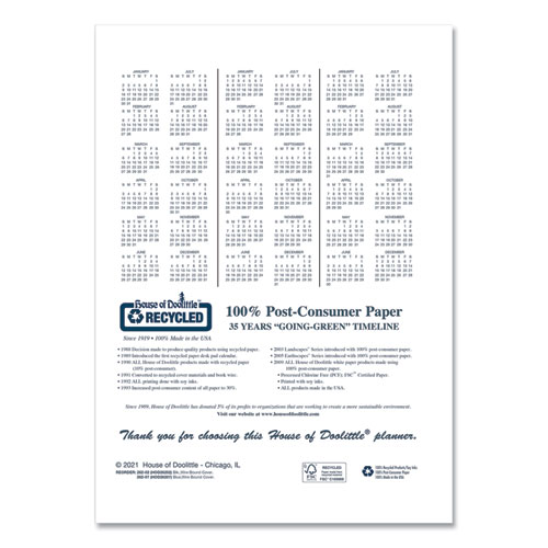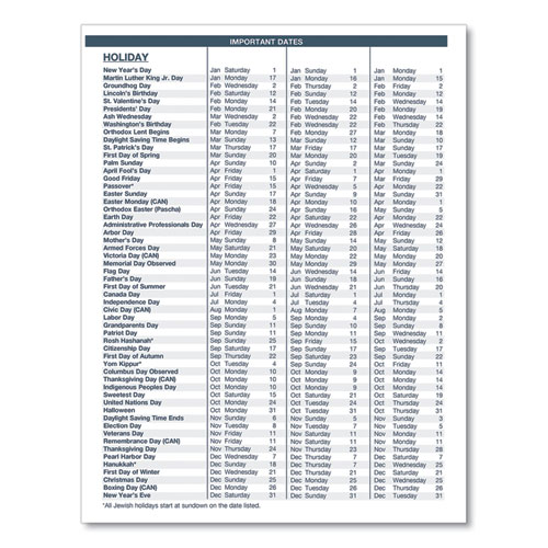 Product Details** Global Product Type Appointment Book/Personal Organizers Dated Yes Academic Year No Calendar Format Monthly Edition Year 2024 to 2026 Calendar Term 14-Month (Dec to Jan) Binding Type Wire-O Color Family Black Refillable No Calendar Spread Format One Month per Two-Page Spread Julian Dates Yes Size (Bound-Side First) 11 x 8.5 Binding Details Twin-Wire: Soft Cover Cover Color(s) Black Cover Material(s) Embossed Simulated Leather Appointment Ruling Open Scheduling Calendar Reference Blocks One Past Month,One Future Month Separate Sections Phone Messages,Reminders,Three-Year Holiday List,Three-Year Reference Calendar Sheet Color(s) White/Blue Pocket Details Double-Sided Storage Pocket Reversible No Seasonal Availability Yes Product Biodegradability Indicator N Product Biodegradability in Days 0 Product Compostability Indicator N Pre-Consumer Recycled Content Percent 0% Post-Consumer Recycled Content Percent 100% Total Recycled Content Percent 100% Disclaimer Statement This product was made using wood sourced from a certified managed forest. Footnote 1 Future planning section Country Of Origin US Carton Weight 5 lbs. Carton Pack Quantity 10 EA Pack Quantity 0 UPC 040983113465 UNSPSC 44112005 Shipping Weight & Item Dimensions Weight 0.206 lbs. Length 11.375 in Height 0.25 in Width 9.188 in