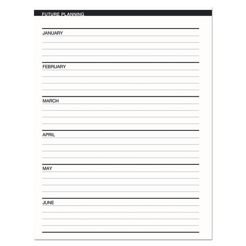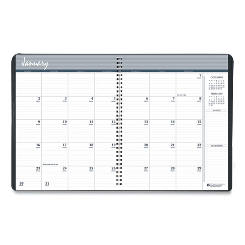 Product Details** Global Product Type Appointment Book/Personal Organizers Dated Yes Academic Year No Calendar Format Monthly Edition Year 2024 to 2026 Calendar Term 14-Month (Dec to Jan) Binding Type Wire-O Color Family Black Refillable No Calendar Spread Format One Month per Two-Page Spread Julian Dates Yes Size (Bound-Side First) 8.75 x 6.78 Binding Details Twin-Wire: Soft Cover Cover Color(s) Black Cover Material(s) Embossed Simulated Leather Appointment Ruling Open Scheduling Calendar Reference Blocks One Past Month,One Future Month Separate Sections Expense Log,Notes/Memos,Phone Messages,Reminders,Three-Year Holiday List,Three-Year Reference Calendar Sheet Color(s) White/Blue Pocket Details Double-Sided Storage Pocket Reversible No Seasonal Availability Yes Product Biodegradability Indicator N Product Biodegradability in Days 0 Product Compostability Indicator N Pre-Consumer Recycled Content Percent 0% Post-Consumer Recycled Content Percent 100% Total Recycled Content Percent 100% Disclaimer Statement This product was made using wood sourced from a certified managed forest. Footnote 1 Includes 12-month expense log and 30 memo pages Country Of Origin US Carton Weight 6 lbs. Carton Pack Quantity 10 EA Pack Quantity 0 UPC 040983268110 UNSPSC 44112005 Shipping Weight & Item Dimensions Weight 0.433 lbs. Length 9.1 in Height 0.6 in Width 7.1 in
