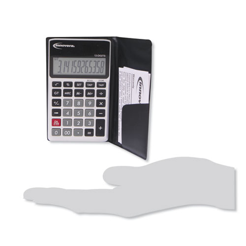 Find the correct answer with this convenient pocket calculator that is ideal for everyday math. Dual solar/battery power provides reliable functionality in any lighting conditions. The 12-digit LCD display handles large calculations. Recall saved numbers with the three memory buttons. Tax Calculation, Square Root, +/- Switch, and Percent keys help to find the answer to more equations. Protective wallet case adheres easily to the calculator and flips out of the way when in use.