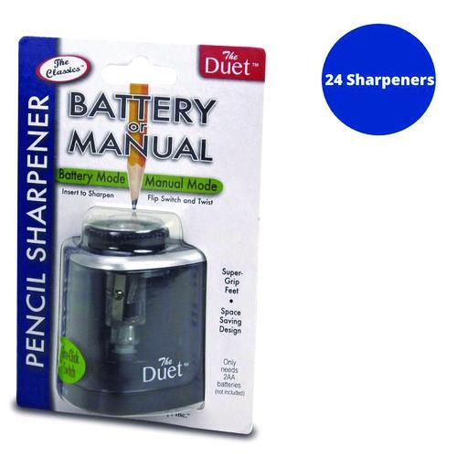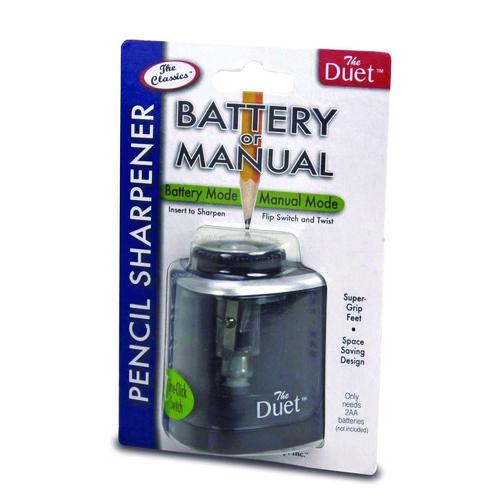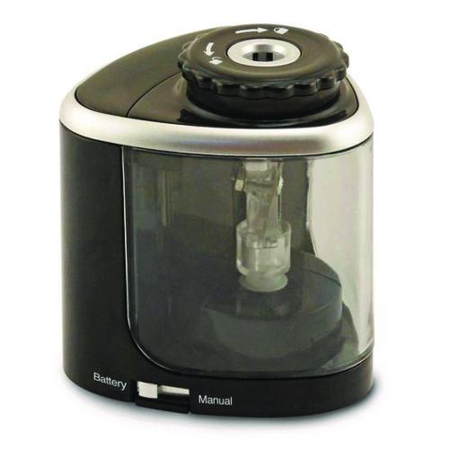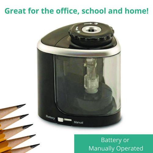 This 2-in-1 sharpener allows for precision battery powered sharpening. With one-click of the switch, the top-quality blade becomes a standard hand-held manual sharpener. Great for office and classroom environments where quiet is intermittently important. Perfectly sized for travel or the on-the-go professional. Precision steel blade. Easy-to-remove locking top. Super grip feet. Space-saving design. Requires 2 AA batteries (not included).