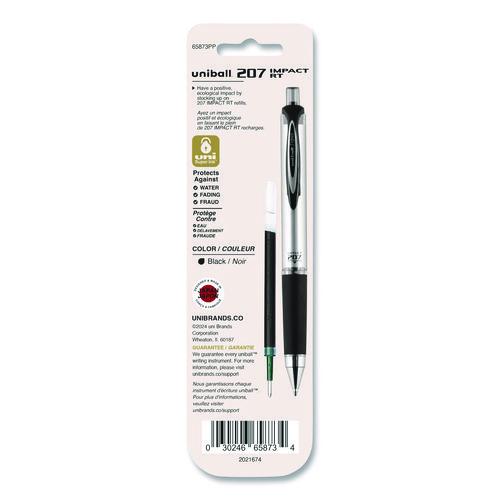 Product Details** Global Product Type Gel Pen Refills Refill Format Standard Gel Color Family Black Tip/Nib Type Conical Tip/Nib Size Type Bold Erasable Ink No Refill For Series uniball® 207 Impact RT Gel Retractable Pens Refill Ink Color Black Tip/Nib Size [Num] 1 mm Permanent/Washable Ink Permanent Archival-Quality Ink Yes Airplane-Safe Ink Yes Low-Viscosity Ink Yes For Use With [SKU Number] uniball® 65870 Product Biodegradability Indicator N Product Biodegradability in Days 0 Product Compostability Indicator N Pre-Consumer Recycled Content Percent 0% Post-Consumer Recycled Content Percent 0% Total Recycled Content Percent 0% Country Of Origin JP Carton Weight 2 lbs. Carton Pack Quantity 48 PK Pack Quantity 2 EA UPC 030246658734 UNSPSC 44121904 Shipping Weight & Item Dimensions Weight 0.026 lbs. Length 7.6 in Height 0.3 in Width 2.1 in