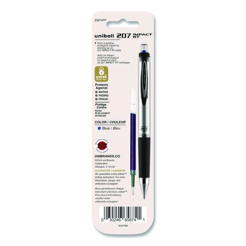 Product Details** Global Product Type Gel Pen Refills Refill Format Standard Gel Color Family Blue Tip/Nib Type Conical Tip/Nib Size Type Bold Erasable Ink No Refill For Series uniball® 207 Impact RT Gel Retractable Pens Refill Ink Color Blue Tip/Nib Size [Num] 1 mm Permanent/Washable Ink Permanent Archival-Quality Ink Yes Airplane-Safe Ink Yes Low-Viscosity Ink Yes For Use With [SKU Number] uniball® 65871 Product Biodegradability Indicator N Product Biodegradability in Days 0 Product Compostability Indicator N Pre-Consumer Recycled Content Percent 0% Post-Consumer Recycled Content Percent 0% Total Recycled Content Percent 0% Country Of Origin JP Carton Weight 2 lbs. Carton Pack Quantity 48 PK Pack Quantity 2 EA UPC 030246658741 UNSPSC 44121908 Shipping Weight & Item Dimensions Weight 0.025 lbs. Length 7.6 in Height 0.3 in Width 2.1 in