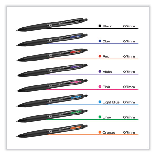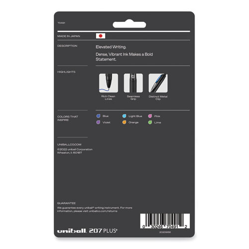 Product Details** Global Product Type Gel Pens Pen Style Retractable Pen Tip Type Conical Pen Point Size Type Medium Color Family Multicolor Erasable Ink No Refillable No Pen Sub-Brand & Product Family 207 Plus+ Pen Type Gel Pen Pen Point Size 0.7 mm Pen Ink Color(s) Assorted Inspirational Pen Ink Color(s) Assortment Blue,Light Blue,Lime Green,Orange,Pink,Violet Pen Barrel Color(s) Black Low-Viscosity Ink No Special Ink Properties uni Nano Fiber Super Ink™ PLUS+ Pen Grip Type Rubber Visible Ink Supply No Pocket Clip Indicator Yes Product Biodegradability in Days 0 Pre-Consumer Recycled Content Percent 0% Post-Consumer Recycled Content Percent 0% Total Recycled Content Percent 0% Country Of Origin JP Carton Weight 3 lbs. Carton Pack Quantity 12 PK Pack Quantity 6 EA UPC 030246704912 UNSPSC 60121524 Shipping Weight & Item Dimensions Weight 0.165 lbs. Length 7.6 in Height 0.65 in Width 4.75 in