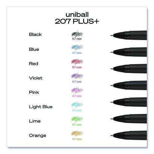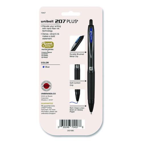 Product Details** Global Product Type Gel Pens Pen Style Retractable Pen Tip Type Conical Pen Point Size Type Medium Color Family Blue Erasable Ink No Refillable No Pen Sub-Brand & Product Family 207 Plus+ Pen Type Gel Pen Pen Point Size 0.7 mm Pen Ink Color(s) Blue Pen Barrel Color(s) Black Low-Viscosity Ink No Special Ink Properties uni Nano Fiber Super Ink™ PLUS+ Pen Grip Type Rubber Visible Ink Supply No Pocket Clip Indicator Yes Product Biodegradability in Days 0 Pre-Consumer Recycled Content Percent 0% Post-Consumer Recycled Content Percent 0% Total Recycled Content Percent 0% Country Of Origin JP Carton Weight 7 lbs. Carton Pack Quantity 48 PK Pack Quantity 4 EA UPC 030246704578 UNSPSC 60121524 Shipping Weight & Item Dimensions Weight 0.115 lbs. Length 7.65 in Height 0.65 in Width 3.75 in