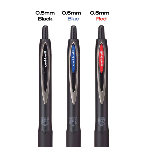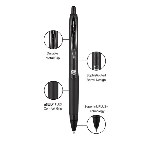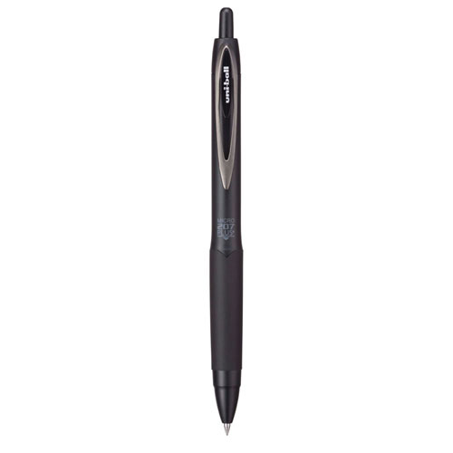 Product Details** Global Product Type Gel Pens Pen Style Retractable Pen Tip Type Conical Pen Point Size Type Micro Color Family Black Erasable Ink No Refillable Yes Pen Sub-Brand & Product Family 207 Plus+ Pen Type Gel Pen Pen Point Size 0.5 mm Pen Ink Color(s) Black Pen Barrel Color(s) Black Permanent/Washable Ink Permanent Archival-Quality Ink Yes Airplane-Safe Ink Yes Low-Viscosity Ink No Special Ink Properties uni Super Ink™ PLUS+ Pen Grip Type Rubber Visible Ink Supply No Pocket Clip Indicator Yes Product Biodegradability Indicator N Product Biodegradability in Days 0 Product Compostability Indicator N Compliance Standards ACMI AP Non-Toxic Certified Pre-Consumer Recycled Content Percent 0% Post-Consumer Recycled Content Percent 0% Total Recycled Content Percent 0% Disclaimer Statement uni-ball® guarantees smooth, worry-free writing with every uni-ball® pen. If you’re not completely satisfied with our product, simply return it for replacement or a full refund. Find complete return instructions at uniballco.com/returns. Country Of Origin JP Carton Weight 5 lbs. Carton Pack Quantity 12 DZ Pack Quantity 0 UPC 030246706060 UNSPSC 44121704 Shipping Weight & Item Dimensions Weight 0.03 lbs. Length 5.625 in Height 0.625 in Width 0.5 in