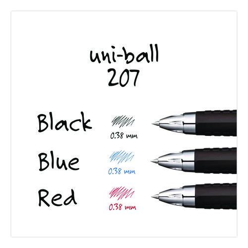 Stock your office, home or classroom with 207 Retractable Gel Pens from uni-ball featuring a 0.38 mm ultra micro point with a stainless steel tip that resists bending and breaking. Even-flowing, pigment-based gel ink delivers a smooth writing experience for intense, vibrant lines, ensuring that every mark is brilliantly communicated. Use these retractable gel pens for everyday writing tasks, check signing and all of your important signatures, trusting its quick-drying uni Super Ink. Innovative uni Super Ink technology effectively entraps the gel ink into the paper, producing fraud, fade and water-resistant documents that resist check washing or bleaching. The 0.38 mm ultra micro point produces neat and precise strokes for intricate writing, making it easy to create super fine details in your drawings and diagrams. A textured grip offers greater comfort and control as you continue writing, while a translucent ink window indicates the level of gel ink remaining, so you don’t run out unexpectedly. The sleek design of the 207 with modern metal accents gives the retractable gel pen a stylish touch.