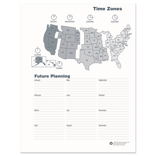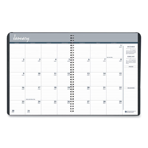 Unique two-year planner for long-range scheduling with room to note necessary appointments and needed information. One-month per two-page spread with generous space for important information. Includes a double-sided storage pocket. Each day space is lined for optimum use, with Julian dates/days as well as previous and next month reference calendars. Embossed simulated-leather cover. Made entirely of recycled materials.