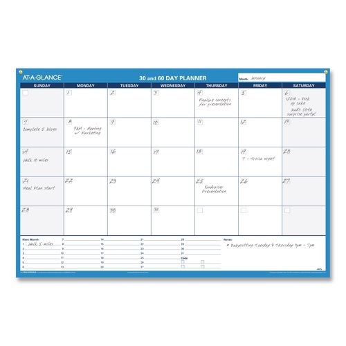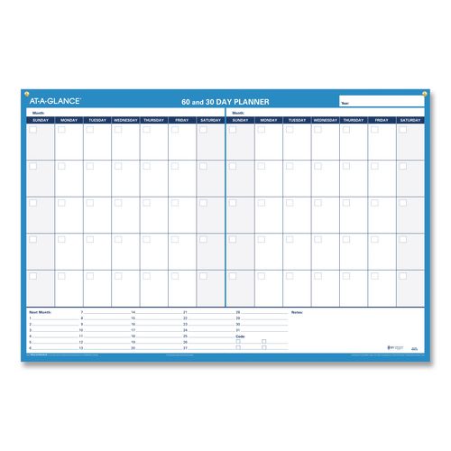 Product Details** Global Product Type Wall Calendars Dated No Academic Year No Calendar Format Monthly,Bi-Monthly Calendar Term 30-Day,60-Day Color Family White Refillable No Calendar Spread Format Horizontal: One Block Month per Page,Vertical: Two Block Months per Page Julian Dates No Size (Bound-Side First) 36 x 24 Sheet Color(s) White/Blue Reversible Yes Seasonal Availability No Product Biodegradability Indicator N Product Biodegradability in Days 0 Product Compostability Indicator N Package Includes (1) Wet Erase Marker Pre-Consumer Recycled Content Percent 0% Post-Consumer Recycled Content Percent 0% Total Recycled Content Percent 0% Footnote 1 Side One Block Size: 5 x 3.38,Side Two Block Size: 2.5 x 3 Country Of Origin US Carton Weight 4 lbs. Carton Pack Quantity 6 EA Pack Quantity 0 UPC 038576553439 UNSPSC 44111901 Shipping Weight & Item Dimensions Weight 0.688 lbs. Length 25.127 in Height 2.875 in Width 2.875 in