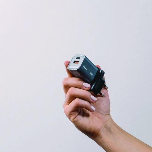 Supports charging of up to two devices simultaneously with a maximum total output of 35 W. Equipped with one USB-C Power Delivery port, one USB-A Quick Charge port, and Programmable Power Supply ideal for super-fast charging. Integrated GaN technology provides efficient charging and generates less heat. Great travel companion thanks to foldable US prongs, replaceable EU and UK plugs and its slim, compact design. Flame-resistant. Four safety protection features: over-current, over-voltage, short circuit, and over-temperature. Plastic-free packaging.