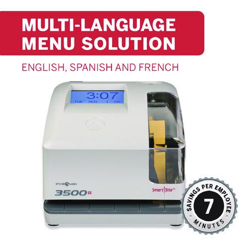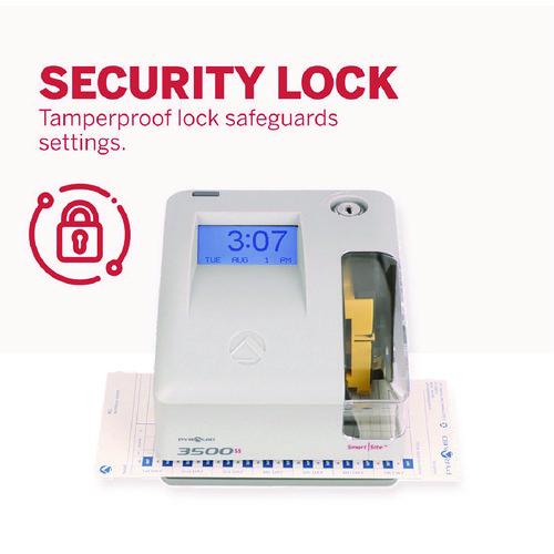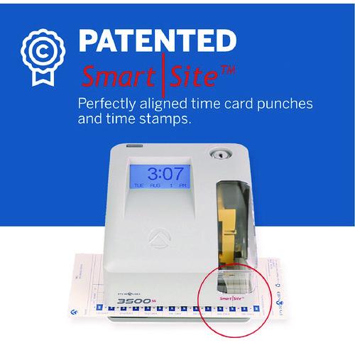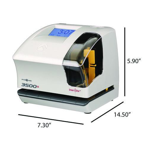 Do more with the Pyramid Time Systems model 3500ss multi-purpose time clock and document stamp. Perfect for the busy small business the 3500ss is a punch clock plus document stamp all-in-one. Record employee time and attendance by tracking job costs plus stamping documents. Track employees start times, break times, lunch times and finish times on a weekly timecard, or select from 14 pre-programmed message options to stamp invoices, attendance logs, legal paperwork or other time-sensitive documents. The side-loading timecard and document feed accommodates left- or right-hand orientation. An alignment guide helps line up punches. Prints the date and time (AM/PM or military time format) on weekly employee timecard. Internal battery backup safeguards data and settings up to seven days without power. Automatic reset for short months, leap year and daylight saving time.
