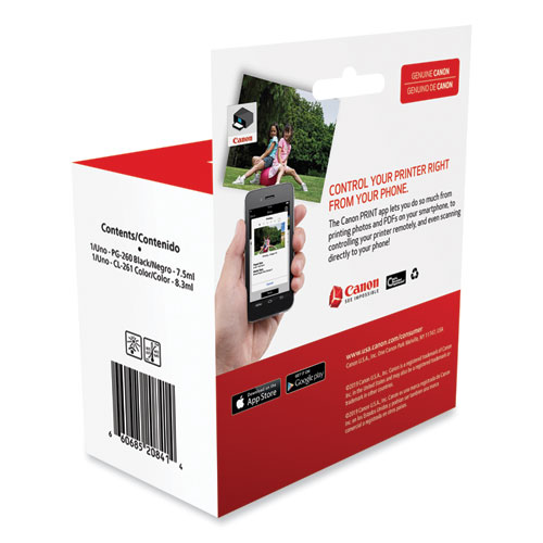 The PG-260 Black Ink Cartridge produces crisp, sharp black text for all your documents while the CL-261 XL Color Ink Cartridge produces colorful photos and images.