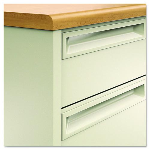 High-pressure laminate top is moisture-, scratch- and stain-resistant. Tru-fit mitered drawers operate on heavy-duty steel ball bearing suspensions. High-sided file drawers extend fully and accept hanging files without hang rails; box drawers extend three-quarters. HON® “One Key” core removable locks. Two work surface grommets help control cord and wires. Three-quarter height modesty panel for privacy.