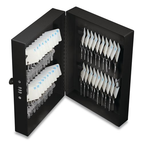 Features 0.16 cubic feet of interior storage capacity. Three-digit combination lock. 40 key capacity, key tags included. Scratch resistant powder coat finish. Predrilled holes for mounting. Mounting hardware included.