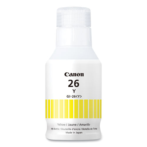 Product Details** Global Product Type Ink/Ink Cartridges OEM/Compatible OEM Supply Type Ink Ink Base Pigment-Based Device Types Inkjet Printer Color(s) Yellow Page-Yield 14,000 Market Indicator (Cartridge Number) GI-26 Remanufactured No For Use With Canon® MAXIFY GX6020, GX7020 Product Biodegradability Indicator N Product Biodegradability in Days 0 Product Compostability Indicator N Pre-Consumer Recycled Content Percent 0% Post-Consumer Recycled Content Percent 0% Total Recycled Content Percent 0% Country Of Origin JP Carton Weight 12 lbs. Carton Pack Quantity 24 EA Pack Quantity 0 UPC 013803330878 UNSPSC 44103105 Shipping Weight & Item Dimensions Weight 0.46 lbs. Length 7.13 in Height 2.24 in Width 2.24 in