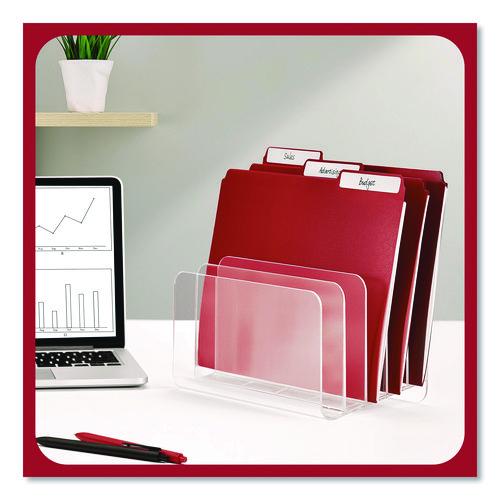 The staggered design displays stored documents clearly, and five individual compartments provide plenty of space for grouped storage. This plastic TRU RED™ five-slot incline sorter’s considered sizing leaves ample room for other workspace tools atop your desk.