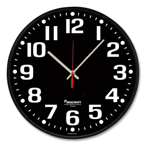 Make telling time easy with the SKILCRAFT® High Contrast Wall Clock. Large, bold white numbers against a contrasting black background make this wall clock easy to see from a distance. This clock features easy, secure mounting hardware and comes in a shatter resistant UV-protected lens. Accurate within +/- two minutes per year. Frame and body are made from recycled materials. Uses one AA battery (not included).