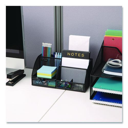 • The black mesh material of this seven-compartment desktop organizer is stylish and fits with any desktop decor.