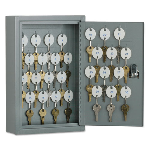 Durable cabinet of heavy-gauge, rolled formed welded steel features a door-length hinge design, secure cylinder key lock and a baked enamel scratch resistant finish that protects from corrosion. Includes plastic key tags, log sheets and mounting hardware.