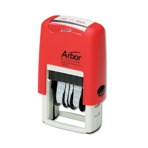 Compact date stamp provides month, day and year with ten year bands. Self-inking stamp has a built-in ink pad that can be re-inked or replaced. Red ink.