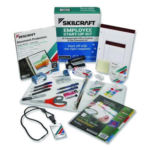 The desk starter kit contains SKILCRAFT office products including 1 – 8.5″ x 11″ ruled white writing pad, 1 – 5″ x 8″ ruled white writing pad, 1 “post-it” note pad, 4-pack of self-stick document flags, 1 bag of paper clips, 1 tape dispenser with tape, 3 ball point pens, 4-pack of fluorescent highlighters, 1 permanent ink black marker, 1 white correction tape, 1 stapler, 1 box of staples, 1 dozen small binder clips, 2 – 7 mm mechanical pencils with 1 tube of lead refills and 1 box of eraser refills, 1 – 1″ 3-ring binder, 1 set of 5-tab 3-ring binder dividers, 1 pack of 3-ring binder page protectors, 1 ID card holder with neck lanyard, and scissors.