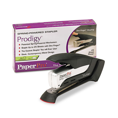 Patented spring-powered stapler allows you to staple 28 paper sheets with the press of one finger.