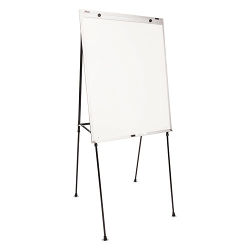 Four sturdy steel legs adjust from 40 to 70″ in height for both tabletop and free-standing use. Rubber feet prevent skidding while protecting surfaces. Melamine dry-erase writing surface features an adjustable silver-aluminum frame with a spring-loaded flip chart holder. Recommended for light use. Clean regularly for best results.