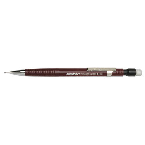 Product Details** Global Product Type Mechanical Pencils Retractable Yes Eraser (Yes/No) Yes Color Family Black Numeric Graphite Scale #2.5 HB Graphite Scale F Refillable Yes Graphite Color(s) Black Pencil Barrel Color(s) Burgundy Pencil Barrel Material Plastic Pencil Grip Type Ribbed Plastic Graphite Diameter 0.5 mm Pencil/Eraser Refill AbilityOne® SKILCRAFT® 7510-01-332-8794, 7510-01-317-6421 Pocket Clip Indicator Yes Mechanical Pencil Advance Type Top-Advance Mechanical Pencil Sleeve Type Sliding Sleeve Product Biodegradability Indicator N Product Biodegradability in Days 0 Product Compostability Indicator N Pre-Consumer Recycled Content Percent 0% Post-Consumer Recycled Content Percent 0% Total Recycled Content Percent 0% Country Of Origin US Carton Weight 3 lbs. Carton Pack Quantity 6 DZ Pack Quantity 0 UPC 071503295088 UNSPSC 44121705 Shipping Weight & Item Dimensions Weight 0.35 lbs. Length 1 in Height 6.25 in Width 2.75 in