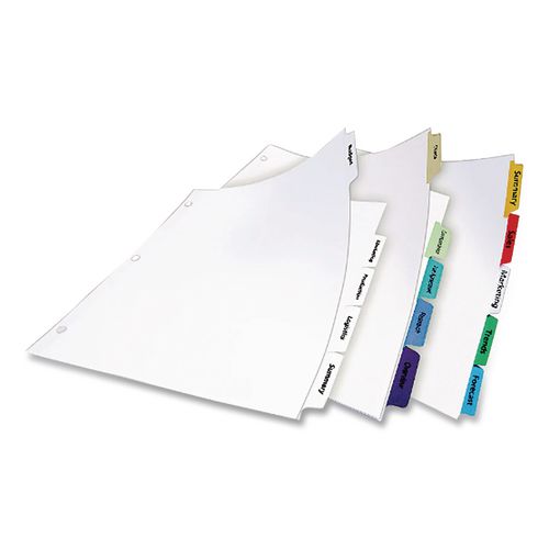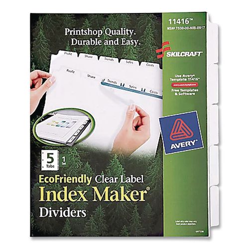 Product Details** Global Product Type Customizable Index Dividers Index Divider Style Customizable Tab Orientation Side Tab Tab Style 5-Tab Color Family White Punched/Unpunched 3-Hole Punched Index Divider Size 11 x 8.5 For Use With Ring Binders Index Divider Material(s) Paper Index Divider Color(s) White Tab Material(s) Paper Tab Color(s) White Machine Compatibility Inkjet Printers,Laser Printers Index Divider Form Quantity 1 Set Product Biodegradability Indicator N Product Biodegradability in Days 0 Product Compostability Indicator N Pre-Consumer Recycled Content Percent 0% Post-Consumer Recycled Content Percent 100% Total Recycled Content Percent 100% Country Of Origin US Carton Weight 10 lbs. Carton Pack Quantity 80 ST Pack Quantity 5 EA UPC 071503289223 UNSPSC 44122008 Shipping Weight & Item Dimensions Weight 0.17 lbs. Length 11 in Height 0.06 in Width 9 in