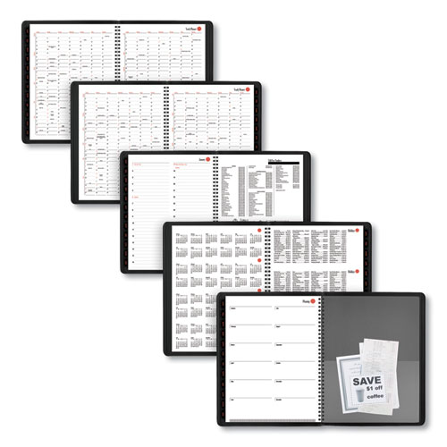 • Planner has a black, premium simulated leather cover and twin wire binding for enhanced durability.