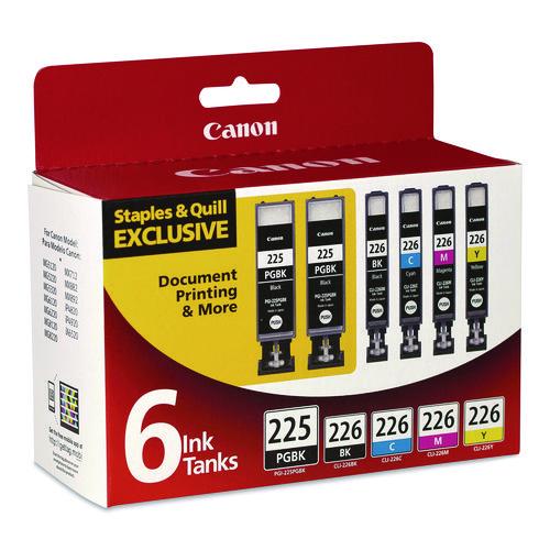 Create long-lasting prints that resist fading with this six-pack of black and color ink cartridges. The standard page yield is ideal for use in home or small offices, and the cartridges are simple to install in select PIXMA machines for added convenience. These Canon® ink cartridges feature an individual tank system to improve efficiency, while the vivid inks help text and images stand out. This package includes two PGI-225 black cartridges and one of each PGI-226 black, cyan, magenta, and yellow cartridges.