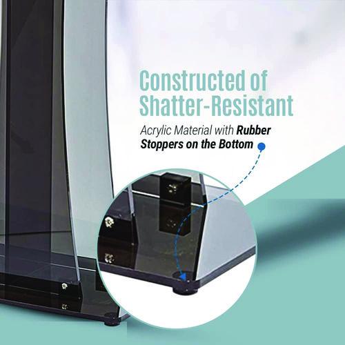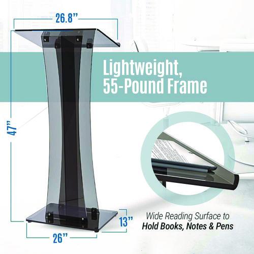 Add panache and pizzazz to your presentations with this speaker’s stand. Speakers can make their positions clear from a position of power while keeping things organized and running smoothly. This stylish podium is ruggedly designed using acrylic plexiglass material to furnish long-lasting strength and use for years to come. Even though acrylic is lightweight, it boasts great strength and is shatter-resistant. It won’t break even if it hits the ground, and effortlessly shrugs off point-making pounding when you become passionate about your topic! Its sleek, swept-back modern design will seamlessly enhance any interior space, plus it suggests that presenters are keeping up with the times regardless of what they are presenting. You can refresh yourself or your memory utilizing the handy, built-in beverage and note shelf. Boasting a 47″ height and a generous, presentation surface, this sleek podium will deliver a professional look anywhere it’s used. The generous, lip-equipped surface prevents papers and books from sliding, keeping your notes in place when reading so your presentation goes off without a hitch. Meanwhile, the large base provides stability and is outfitted with four rubber feet to protect floors from scratches and unsightly scuff marks. This attractive, durable podium is ideal for use in meeting halls and religious establishments to make a speech, in the classroom to give lectures, or in restaurants to keep reservations and waiting lists handy. It includes eight screws and assembly tools so you can easily affix the base and reading surface, allowing you to stand up and let your ideas be heard in no time at all.