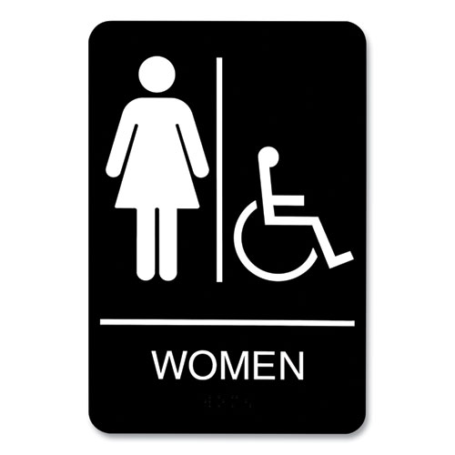 Universally and easily recognizable white graphics. Raised tactile graphics with Grade 2 Braille. Meets Americans with Disabilities Act (ADA) requirements. Includes double-side adhesive tape for mounting to door or wall.