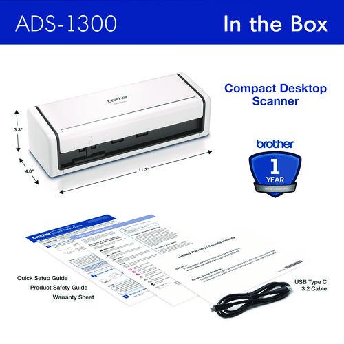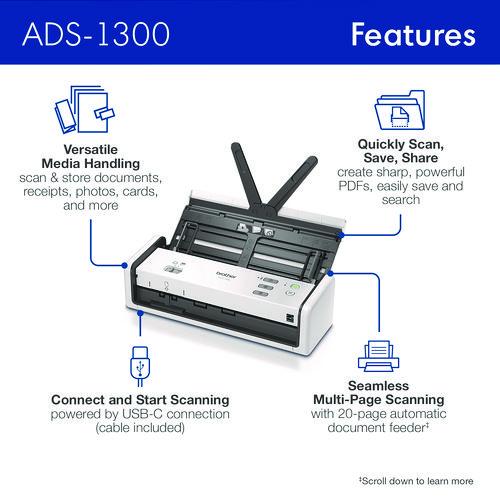 From work or home, the Brother ADS-1300 Compact Desktop Scanner is ready to work with you. Perfect for occasional or everyday scanning, connect, scan and store directly to your computer. Easily handles multiple document types, including photos, plastic cards, receipts and more, producing consistently sharp results. Feed pages into the 20-page automatic document feeder for quick scanning it even scans double-sided pages in a single pass. There’s no need for extra cables, this energy-efficient scanner is powered directly through a USB-C connection, making this machine super portable. Comes with a robust software bundle to manage and edit scanned files