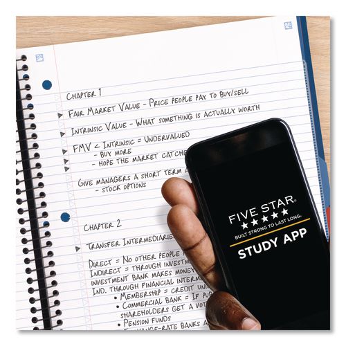 Product Details** Global Product Type General Purpose Notebooks Pocket Sized No Book-Binding Type Spiral Coil Color Family Multicolor Number of Subjects/Sections 3 Sheet Size (Bound-Side First) 11 x 8.5 Sheet Rule/Format Type Medium/College Rule Book-Binding Edge Side Cover Color Randomly Assorted Cover Color Assortment Amethyst Purple,Black,Fire Red,Pacific Blue,Seaglass Green,White Book-Spine Length 11″ Book Width 8.5″ Front-Cover Material Poly Back-Cover Material Poly Number of Section Dividers 3 Sheets per Book/Journal 150 Sheet Color White Sheet Ruling Size 9/32″ Note-Rule Lines per Sheet 33 Sheet-Ruling Color Blue Hole-Punch Details Side: 3-Hole Sheet Perforation Details Macro-Perforation Sheet Basis Weight (lb) 56 lb Text Number of Pockets 6 Pocket Details Loose-Sheet Pockets Dated No Product Biodegradability Indicator N Product Biodegradability in Days 0 Product Compostability Indicator N Pre-Consumer Recycled Content Percent 0% Post-Consumer Recycled Content Percent 0% Total Recycled Content Percent 0% Disclaimer Statement Cover color is randomly selected when shipped—item may not ship as shown. Guarantee is valid for one year from purchase or delivery date, whichever is longer. Go to Five Star® website for details. Country Of Origin VN Carton Weight 11 lbs. Carton Pack Quantity 6 EA Pack Quantity 0 UPC 043100063247 UNSPSC 14111514 Shipping Weight & Item Dimensions Weight 1.677 lbs. Length 11.25 in Height 1.25 in Width 10 in
