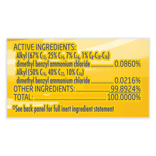 Product Details** Global Product Type Disinfectants/Cleaners Physical Form Liquid Scent Lemon Breeze® Volume Capacity 32 oz Product Packaging Trigger Spray Bottle Application Disinfectant/Cleaner Applicable Material Ceramics,Enamel,Fiberglass,Laminates,Metal,Plastic,Vinyl Chemical Compound Quanternary Ammonium Compounds,Benzyl-C12-16,Alkyldimethyl,Chlrorides Dirt Types Bacteria,Dust,Germs,Grease,Grime,Viruses Product Biodegradability Indicator N Product Biodegradability in Days 0 Product Compostability Indicator N Compliance Standards EPA Reg. No. 777-91,EPA List N,Complies with All Various State Phosphate Regulations,Fully Registered with the Federal EPA and Each of the 50 State EPA Agencies (And the District of Columbia),TSCA Compliant,VOC Compliant Pre-Consumer Recycled Content Percent 0% Post-Consumer Recycled Content Percent 0% Total Recycled Content Percent 0% Disclaimer Statement Rinse all food contact surfaces with water after use. Does not harm most kitchen surfaces. On painted surfaces, test a small, inconspicuous area first. Do not use on eating/cooking utensils, glasses, dishes or cookware, unfinished, oiled or waxed wood floors. This product is not recommended for use on marble, brass, acrylic plastic or unfinished wood surfaces. Country Of Origin US Carton Weight 31 lbs. Carton Pack Quantity 12 EA Pack Quantity 0 UPC 019200003513 UNSPSC 47131803 Shipping Weight & Item Dimensions Weight 2.4 lbs. Length 10.63 in Height 3 in Width 5.14 in