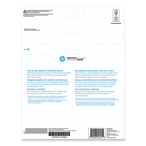 Product Details** Global Product Type Photo Print Sheets Sheet/Roll Size 8.5 x 11 Color Family White Paper/Media Thickness (mil) 10.5 mil Paper/Media Color(s) White Paper Finish Glossy Machine Compatibility Inkjet Printers Sheets Per Unit 50 Product Biodegradability in Days 0 Pre-Consumer Recycled Content Percent 0% Post-Consumer Recycled Content Percent 0% Total Recycled Content Percent 0% Special Features Value Pack—Stock up and save! Country Of Origin DE Carton Weight 10 lbs. Carton Pack Quantity 5 PK Pack Quantity 50 SH UPC 829160743172 UNSPSC 14121812 Shipping Weight & Item Dimensions Weight 1.928 lbs. Length 1 in Height 12.1 in Width 9.3 in