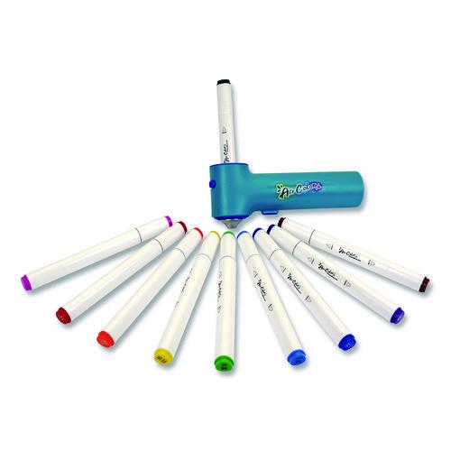 Unleash your creativity with the AirColor™ Airbrush Marker Kit, the ultimate tool for young artists ages 6 to 14. This easy-to-use, washable airbrush kit allows you to create stunning, vibrant airbrush effects without any mess. This kit includes an array of dual-tip markers, each one with a chisel tip on one end, and a bullet tip on the other. The bullet tip effortlessly slides into the AirColor™ Air Brush. The possibilities for artistic expression are endless! Whether you’re designing with stencils or free-handing your masterpieces, the AirColor™ kit makes airbrushing a breeze. Each kit includes everything you need to start creating right away—one cordless airbrush device, 10 washable dual-tip markers, two reusable stencils, and a charging cable. It’s the perfect gift for birthdays, holidays, or any occasion that calls for a splash of color and creativity. Safe and designed with young creators in mind, this kit offers a clean, fun, and engaging experience that will spark the imagination of any child.