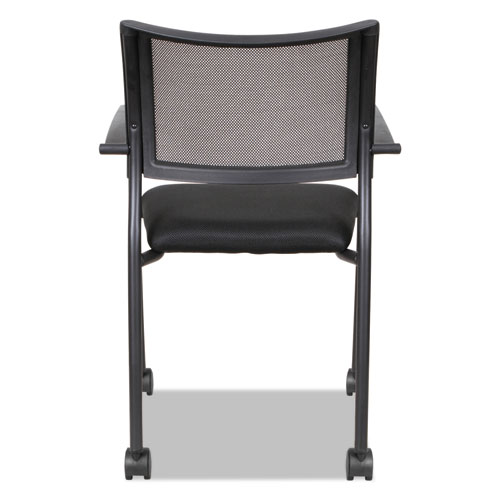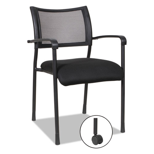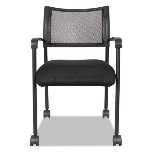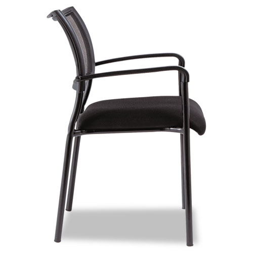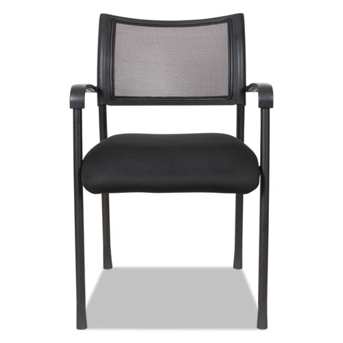 Mesh back chair with cushioned mesh fabric seat for cool comfort. Contoured back provides lumbar support. Durable steel frame with textured matte black finish. Stacks up to five high. Two chairs per carton. Assembly required.