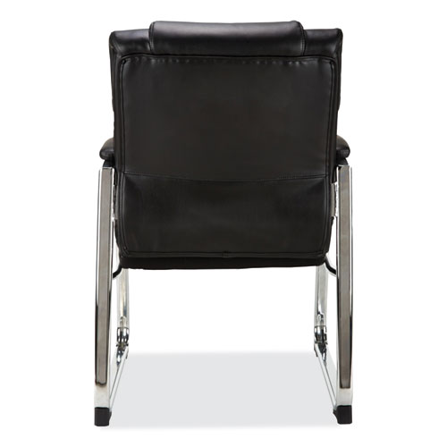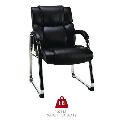 Welcome visitors to your lobby or office with a comfortable and stylish leather guest chair. Plush comfort with segmented seat and back padding. Curved, padded armrests offer upper body support. The bonded, durable leather upholstery wipes clean, making it ideal for lobbies or waiting areas. The sled-shaped base keeps the chair stable and integrated floor glides prevent scratches and scuffs. The polished chrome accents and sleek silhouette add an upscale, modern look to your office, reception area, or lobby.