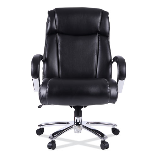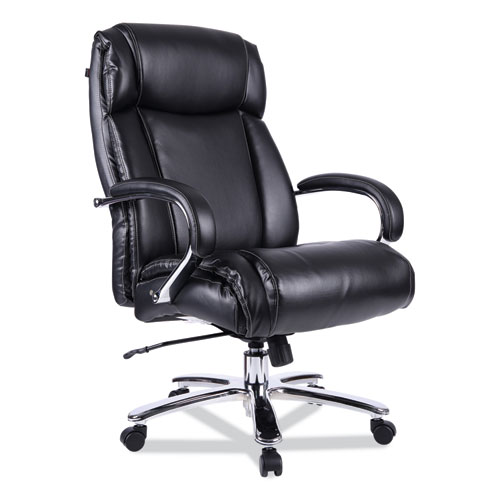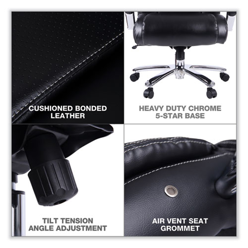 This cushioned, bonded leather chair provides maximum comfort and support for the big and tall users. Unique gel cooling pad technology under the upholstery provides constant even cooling. Coil spring technology in the seat enhances the sitting experience for a more mattress-like support. Heavy-duty, chrome base and mechanism are reinforced and help to evenly distribute weight. Waterfall seat edge helps to reduce pressure points at the back of the knee.