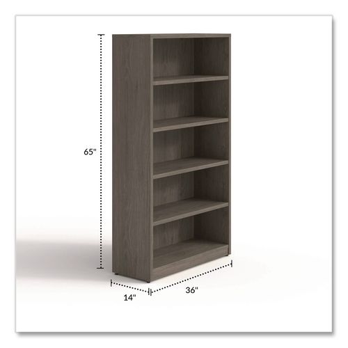 Product Details** Global Product Type Standard Multi-Shelf Bookcases Color Family Walnut Material(s) Melamine,Wood Number of Shelves 5 Overall Height 65″ Overall Width 36″ Shelf Capacity (Weight) 85 lb Color(s) Walnut Overall Depth 14″ Overall Unit Weight Capacity 460 lb Shelf Thickness 1″ Edge Detail Profile Square Door Quantity 0 Series Name Alera® Seville Series Product Biodegradability Indicator N Product Biodegradability in Days 0 Product Compostability Indicator N Pre-Consumer Recycled Content Percent 0% Post-Consumer Recycled Content Percent 0% Total Recycled Content Percent 0% Special Features Five-Shelf—Four adjustable. Country Of Origin CA Carton Weight 164 lbs. Carton Pack Quantity 1 EA Pack Quantity 0 UPC 042167003753 UNSPSC 56101507 Shipping Weight & Item Dimensions Weight 163.86 lbs. Length 65.354 in Height 14.37 in Width 37.008 in Warranty Manufacturer’s limited lifetime warranty.