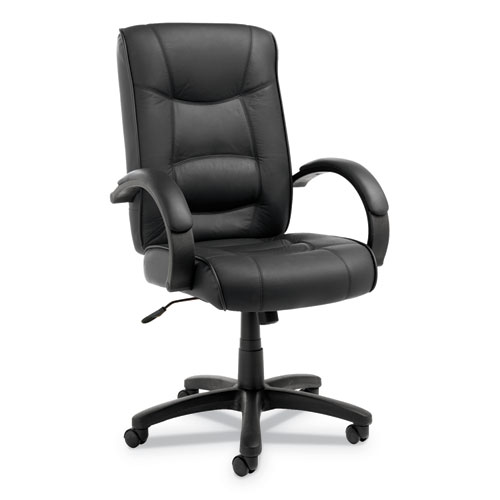 Sink into this luxurious high-back chair for all-day office comfort. Tailored seat and back with top-grain leather upholstery. Waterfall seat design reduces pressure at the back of your knees for improved circulation. Roll armrests feature padded leather caps for added comfort. Heavy-duty nylon base has dual-wheel casters for easy mobility.