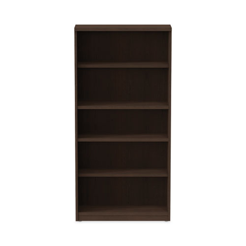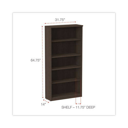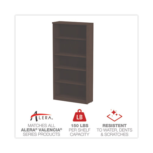 Product Details** Global Product Type Standard Multi-Shelf Bookcases Color Family Brown Material(s) Textured Woodgrain Laminate Number of Shelves 5 Overall Height 64.75″ Overall Width 31.75″ Shelf Capacity (Weight) 150 lb Color(s) Espresso Overall Depth 14″ Shelf Thickness 1″ Edge Detail Profile 3 mm Protective Edge Banding Series Name Alera® Valencia™ Series Product Biodegradability in Days 0 Compliance Standards Meets or Exceeds ANSI/BIFMA Standards Pre-Consumer Recycled Content Percent 0% Post-Consumer Recycled Content Percent 0% Total Recycled Content Percent 0% Country Of Origin CN Carton Weight 129 lbs. Carton Pack Quantity 1 EA Pack Quantity 0 UPC 042167304690 UNSPSC 56101507 Shipping Weight & Item Dimensions Weight 128.75 lbs. Length 65.75 in Height 5.31 in Width 32.48 in Warranty Manufacturer’s limited five-year warranty.