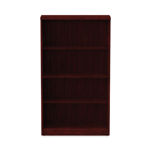 Product Details** Global Product Type Standard Multi-Shelf Bookcases Color Family Mahogany Material(s) Woodgrain Laminate Number of Shelves 4 Overall Height 54.78″ Overall Width 31.75″ Shelf Capacity (Weight) 150 lb Color(s) Mahogany Overall Depth 14″ Shelf Thickness 1″ Edge Detail Profile 3 mm Protective Edge Banding Series Name Alera® Valencia™ Series Product Biodegradability in Days 0 Compliance Standards Meets or Exceeds ANSI/BIFMA Standards Pre-Consumer Recycled Content Percent 0% Post-Consumer Recycled Content Percent 0% Total Recycled Content Percent 0% Country Of Origin CN Carton Weight 109 lbs. Carton Pack Quantity 1 EA Pack Quantity 0 UPC 042167302405 UNSPSC 56101507 Shipping Weight & Item Dimensions Weight 108.03 lbs. Length 57.68 in Height 5.31 in Width 32.48 in Warranty Manufacturer’s limited five-year warranty.