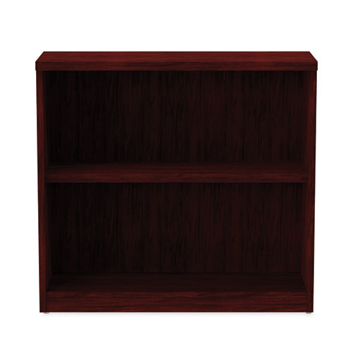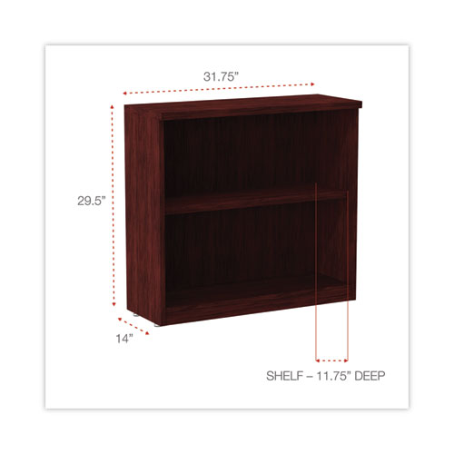 Product Details** Global Product Type Standard Multi-Shelf Bookcases Color Family Mahogany Material(s) Woodgrain Laminate Number of Shelves 2 Overall Height 29.5″ Overall Width 31.75″ Shelf Capacity (Weight) 150 lb Color(s) Mahogany Overall Depth 14″ Shelf Thickness 1″ Edge Detail Profile 3 mm Protective Edge Banding Series Name Alera® Valencia™ Series Product Biodegradability in Days 0 Compliance Standards Meets or Exceeds ANSI/BIFMA Standards Pre-Consumer Recycled Content Percent 0% Post-Consumer Recycled Content Percent 0% Total Recycled Content Percent 0% Footnote 1 Shelf Width: 30.27″ Footnote 2 Shelf Depth: 11.25″ Footnote 3 Distance Between Shelves: 13.35″ Country Of Origin CN Carton Weight 63 lbs. Carton Pack Quantity 1 EA Pack Quantity 0 UPC 042167302368 UNSPSC 56101507 Shipping Weight & Item Dimensions Weight 62.7 lbs. Length 34.25 in Height 5.51 in Width 30.91 in Warranty Manufacturer’s limited five-year warranty.
